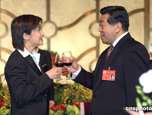 全國(guó)政協(xié)辦公廳、中央統(tǒng)戰(zhàn)部三月九日在北京釣魚(yú)臺(tái)國(guó)賓館舉行港澳地區(qū)政協(xié)委員招待會(huì)。香港嘉賓吳小莉向全國(guó)政協(xié)主席賈慶林祝酒。作者:王辛莉