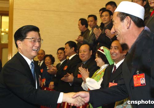 三月十日,全國(guó)人大寧夏代表團(tuán)在北京人民大會(huì)堂審議全國(guó)人大常委會(huì)工作報(bào)告和兩高報(bào)告。中共中央政治局常委、國(guó)務(wù)院副總理黃菊參加審議,聽(tīng)取代表建議。作者:廖文靜