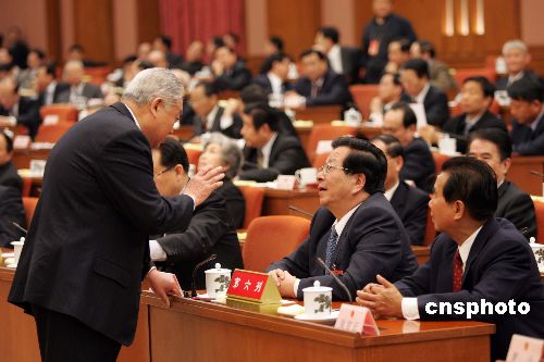 十屆全國(guó)人大三次會(huì)議主席團(tuán)第三次會(huì)議三月十日在北京人民大會(huì)堂舉行,出席會(huì)議的曾慶紅、吳官正與盛華仁(左)一起交談。作者:毛建軍