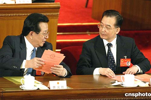 十屆全國人大三次會議第四次全體大會三月十三日在北京人民大會堂召開,胡錦濤當(dāng)選為中華人民共和國中央軍事委員會主席。圖為國務(wù)院總理溫家寶和國家副主席曾慶紅領(lǐng)到選票。作者:廖文靜