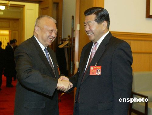 三月十二日,全國政協(xié)十屆三次會議在北京人民大會堂召開閉幕大會。全國政協(xié)主席賈慶林在會前與香港特首董建華互致問候。作者:廖文靜
