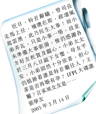 學(xué)友在聲明上先說出大家關(guān)心的社會(huì)大事,然后才承認(rèn)女兒于三八婦女節(jié)出世,母女平安,最搞笑是他說:“小弟弄瓦,只是小事一椿……小弟固然十分欣喜,但心仍惦掛誰是特首繼任人?王菲是否再婚有孕?IFPI大碟誰屬?言承旭女友是……”平日說話沉實(shí)的學(xué)友,突然來個(gè)大幽默,令人大為意外,而他終于如愿再添丁,大家也為他高興。
