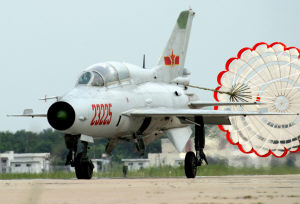 一朵傘花綻開(kāi)———飛機(jī)放出減速傘。