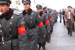 北京保安執(zhí)勤隊員三月十五日為“3.15”消費者日大型活動值勤。北京市保安服務(wù)總公司是我國成立最早、規(guī)模最大的保安服務(wù)公司之一。截止2003年8月,總公司所屬共有28家保安分公司,1家保安科技發(fā)展中心,保安從業(yè)人員53000余人,保安人防客戶單位4300多家,技防客戶單位2100多家,保安服務(wù)遍及全市各行各業(yè),包括聯(lián)合國駐華機構(gòu),外國駐華使館,外國商社,政府機關(guān),金融機構(gòu),大專院校,賓館飯店,商場超市、集貿(mào)市場、繁華街區(qū)、居民社區(qū)等,已初步形成了覆蓋全市的、人防與技防緊密結(jié)合的新型安全防范網(wǎng)絡(luò)。作者:鄒憲