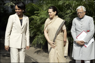 據(jù)鳳凰衛(wèi)視消息,賴斯在晚上飛抵新德里機(jī)場,美國大使和印度官員都到場迎接。盡管對最近朝核問題和臺海局勢的發(fā)展存在關(guān)切,賴斯說,美國與此次受訪各國的關(guān)系正處于歷史最好的時期。