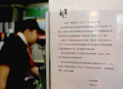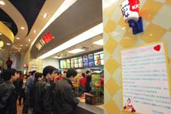 三月十七日,上海肯德基均在餐廳里張貼聲明,解釋“蘇丹紅一號(hào)事件”。十六日晚,在肯德基新奧爾良烤翅和新奧爾良烤雞腿堡調(diào)料中發(fā)現(xiàn)了“蘇丹紅一號(hào)”成分。為了確保萬(wàn)無(wú)一失,該公司決定立即在全國(guó)所有肯德基餐廳停止售賣(mài)新奧爾良烤翅和新奧爾良烤雞腿堡兩種產(chǎn)品,同時(shí)銷(xiāo)毀所有剩余調(diào)料。圖為徐家匯一家肯德基餐廳里張貼了聲明。作者:潘索菲