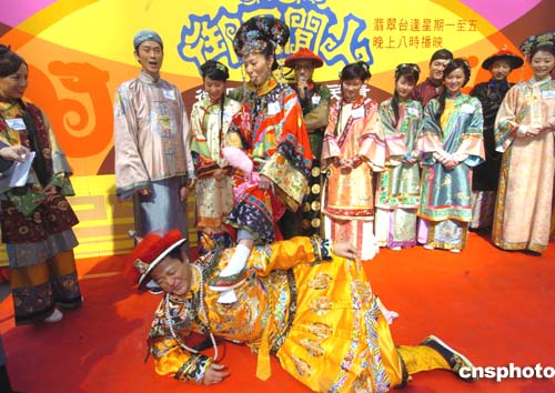 正在香港黃金時(shí)段播出的電視劇《御用閑人》劇中演員身著戲裝19日來(lái)到尖沙咀鬧市區(qū)演戲﹐為該劇播出進(jìn)行宣傳造勢(shì)。作者:趙振清