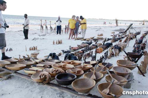 旅游熱潮正席卷全球各個(gè)角落。圖為東非旅游勝地肯尼亞蒙巴薩(mombasa)的海濱沙灘上,到處都是售賣(mài)民俗工藝品的小攤。作者:邢健