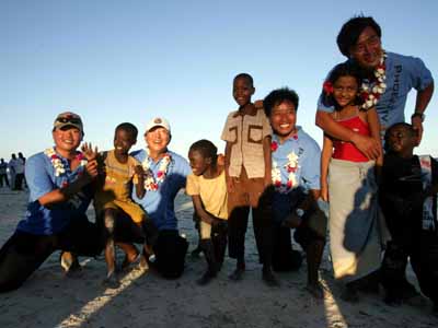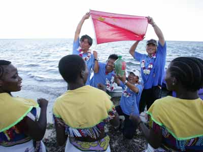 當?shù)貢r間十九日晚,肯尼亞的專業(yè)合唱團體以及少兒演員載歌載舞歡聚一堂,在蒙巴薩白沙海灘,以獨特的非洲風情歌舞,盛迎抵達蒙巴薩的“鳳凰號”,以及前來迎接鳳凰號的中國客人?夏醽喓铣獔F用中文演唱的中國民歌《在那遙遠的地方》博得全場熱烈掌聲。美麗的“二OO四肯尼亞小姐”朱麗葉、在肯留華校友會主席哪吒先生,與鳳凰衛(wèi)視主持人竇文濤和陳魯豫共同主持了晚會。完