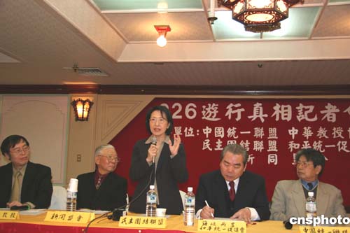 中新社臺北三月二十日電(記者 趙江濤 董會峰)中國統(tǒng)一聯(lián)盟、中華教授協(xié)會、民主團結(jié)聯(lián)盟、和平統(tǒng)一促進會、新同盟會今天在此間舉行“三二六游行真相聯(lián)合記者會”。與會人士指出,以所謂“反‘反分裂法’”、“反并吞”為由發(fā)動“三二六”游行,因果倒置、不負責任,對臺灣民眾沒好處,也無益于兩岸關系改善。