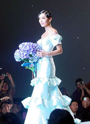 中新網(wǎng)3月24日電 據(jù)新聞晚報報道,昨天(23日)下午,在世貿(mào)商城的韓國時裝紡織博覽會上,韓國明星金素妍、鄭俊鎬身穿韓國頂級時裝大師AndreKim(安德烈·金)設(shè)計的最新服裝舉行了一場別開生面的婚紗秀,贏得了中國影迷的熱烈歡呼。下午三點,婚紗秀現(xiàn)場正式開放,爭相涌進的觀眾讓表演現(xiàn)場一時陷入癱瘓。主辦方不得不現(xiàn)場趕人,沒有邀請函的觀眾一律“清理”。當金素妍和鄭俊鎬雙雙出現(xiàn)在舞臺上時,歡呼聲伴隨著閃光燈爆發(fā)出來,出現(xiàn)了仿佛是搖滾樂演唱會的情景。特別是當鄭俊鎬輕吻金素妍前額時,一些女影迷當場流出了熱淚。