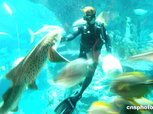 香港海洋公園海洋館的潛水喂養(yǎng)員現(xiàn)場(chǎng)表演。作者:趙振清