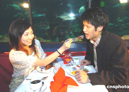 香港海洋公園復(fù)活節(jié)期間在海洋館推出“海底晚宴”﹐在品嘗美食的同時(shí)可欣賞到各種迷人的海洋生物在餐桌旁邊往來(lái)游動(dòng)﹐別有一番風(fēng)趣。作者:趙振清