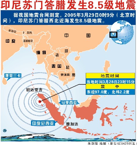 印度尼西亞蘇門答臘島附近海域當?shù)貢r間28日23時9分(北京時間29日零時9分)發(fā)生里氏8.5級強烈地震,印度洋沿岸國家隨即發(fā)出了海嘯警報。印尼警方說,地震可能已造成數(shù)百人死亡或失蹤。