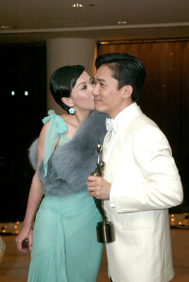 “偉仔”與嘉玲在頒獎禮結束不久即抵達慶功宴會場,五度稱帝的他一直面露笑容,上臺領獎時的緊張一掃而空,嘉玲更即場吻賀男友!皞プ小苯忉專吓_時的心情就好像第一次拿獎一樣緊張,因他已因為《花樣年華》里的周慕云而奪得影帝,今次在《2046》里再演同一個角色,要能夠拿兩次獎,難度非常高。因此,他對獲獎感到十分開心,但同時又承認并不覺得太意外,因他之前已憑《2046》奪得香港電影評論學會的“最佳男演員”獎,自然也想再在金像獎得獎。對于成為五屆影帝,他只以“好彩”來形容,說自己運氣好,王家衛(wèi)“腳頭”也好。另外,出爐影后章子怡繼續(xù)其“少話”本色,慶功宴上仍來去匆匆,不肯多談感受,只表示很開心,已經(jīng)即時致電家人及朋友報喜。