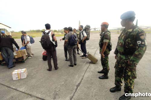 3月31日,印度尼西亞棉蘭某軍用機(jī)場召集世界各地電視臺及報(bào)章記者,安排乘當(dāng)?shù)剀娪蔑w機(jī)到尼亞斯島災(zāi)區(qū)采訪。作者:洪少葵