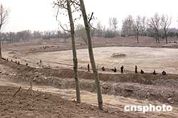 中國國家環(huán)?偩秩涨奥暶鳎瑘A明園湖底鋪設(shè)防滲膜工程至今未進(jìn)行建設(shè)項目環(huán)境影響評價,應(yīng)該立即停止建設(shè),充分征詢社會各界的意見,依法補辦環(huán)境影響評價審批手續(xù)。三月三十一日,投資1億元,持續(xù)數(shù)個月的2000余畝圓明園湖底(鋪塑料)防滲水工程開始停工。圖為圓明園福海西側(cè)一角藏龍臥虎,大型機械余熱方盡。但是,圓明園三園(包括長春園、綺春園),約2000余畝湖底防滲工程已基本鋪設(shè)完成了防滲水塑料,令專家和百姓失望。作者:鄒憲