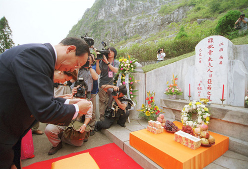 蔣孝嚴此前也數(shù)度來桂林祭母。最近一次是去年七月二十七日,攜夫人黃美倫來到長眠于桂林市郊區(qū)馬鞍山西側(cè)鳳凰嶺下母親章亞若墓前祭奠母親,告慰九泉之下的母親已了卻認祖歸宗的心愿。據(jù)悉,此次蔣孝嚴大陸之行,在桂林只作短暫停留。四日掃墓結束后,當天下午便離開桂林,飛西安出席當?shù)匾粋經(jīng)貿(mào)活動。有消息稱,若時間允許,蔣孝嚴也可能順道訪國民黨主席連戰(zhàn)的祖母墳墓,為連戰(zhàn)的西安之行鋪路。之后會再飛返浙江溪口蔣氏故居祭祖,到毛太夫人墳前掃墓。