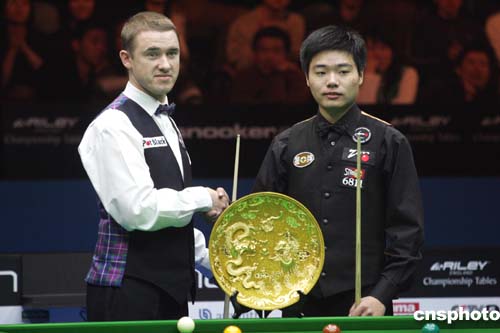 二零零五年四月三日,剛剛度過(guò)十八歲生日的中國(guó)神童丁俊暉在北京海淀體育館舉行的2005中國(guó)斯諾克公開賽決賽中迎戰(zhàn)昔日金童、前世界第一斯蒂芬·亨德利,這是中國(guó)選手在國(guó)際斯諾克排名賽上的最佳戰(zhàn)績(jī)。作者:武仲林