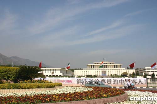 四月四日,在巴基斯坦首都伊斯蘭堡,園林工人正忙碌地?cái)[放鮮花,總統(tǒng)府前的護(hù)欄上懸掛著醒目的“鮮花送給尊貴的中國客人”的中文標(biāo)語。中國國務(wù)院總理溫家寶四月五日起將展開對(duì)巴基斯坦的訪問。作者:齊彬