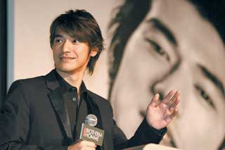 昨天的發(fā)布會(huì)設(shè)在劇場(chǎng)里面,舞臺(tái)兩邊早已掛起金城武最新拍攝的兩張碩大海報(bào),一張溫文爾雅,一張則性感十足。當(dāng)金城武出現(xiàn)時(shí),先是全場(chǎng)一片漆黑,然后又是一陣強(qiáng)光和一團(tuán)煙霧,他一個(gè)人孤零零地站在寬大舞臺(tái)上接受著下面的驚聲尖叫,這種架勢(shì)持續(xù)了好幾分鐘,使得他不好意思地站起身來(lái),一會(huì)兒摸摸腦袋,一會(huì)兒又把手插進(jìn)褲袋。而當(dāng)主持人不斷向他拋來(lái)“你簡(jiǎn)直驚若天人”、“你身上有卓然不同的男人氣質(zhì)”等贊美之語(yǔ)時(shí),他雙手緊握著麥克風(fēng),不斷彎腰說(shuō)謝謝。當(dāng)主持人問(wèn)他喜歡現(xiàn)場(chǎng)掛的哪張廣告照片時(shí),金城武謙虛地說(shuō):“不要再夸我了,其實(shí)突然看見(jiàn)這么大一張自己的臉,我覺(jué)得很別扭!