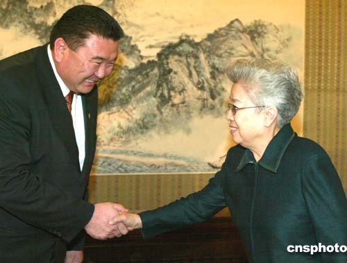 中國國務院副總理吳儀四月七日在北京會見蒙古交通運輸旅游部長、中蒙經(jīng)貿(mào)聯(lián)委會蒙方主席巴特呼。作者:滿會喬