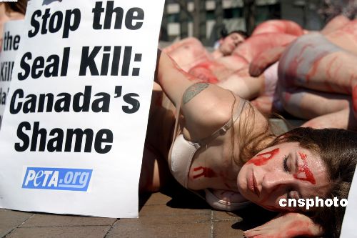 圖:動(dòng)物保護(hù)組織抗議加拿大獵殺海豹