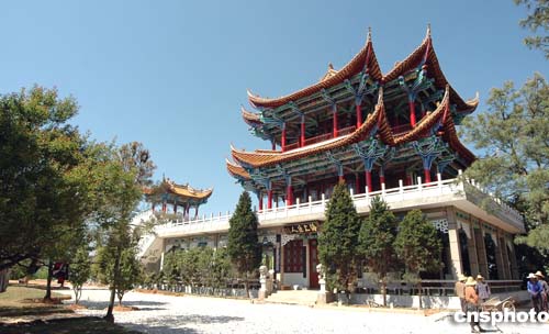 在鄭和故里云南省晉寧縣的鄭和公園里建有一座“三寶樓”,其形似一首巨型鄭和寶船,一層船頭翹首向前,二、三層琉璃瓦制頂,雕龍畫鳳,四周漢白玉欄上的浮雕是根據(jù)鄭和下西洋帶回的珍禽異獸及出國時帶去的瓷器、絲綢等資料精心設(shè)計的。樓上匾額上書寫著“海上巨人”四個金字,記者看到施工人員正在緊張施工。據(jù)當(dāng)?shù)毓賳T介紹,為迎接鄭和下西洋六百周年,晉寧縣政府投資二千三百萬元對鄭和公園進行改擴建。作者:蔣振江