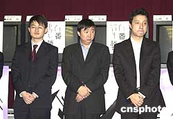 第十八屆富士通杯世界圍棋錦標(biāo)賽四月十一日在日本棋院戰(zhàn)罷第二輪。三名中國(guó)棋手全線告捷,戰(zhàn)勝各自對(duì)手進(jìn)入八強(qiáng)。其中古力七段(圖右)中盤(pán)戰(zhàn)勝韓國(guó)棋手李昌鎬九段;俞斌九段(圖中)以三目半戰(zhàn)勝中國(guó)臺(tái)北周俊勛九段;王檄五段(圖左)中盤(pán)勝日本羽根直樹(shù)九段。圖為三名獲勝的中國(guó)棋手賽后與現(xiàn)場(chǎng)觀眾見(jiàn)面,并進(jìn)行下一輪對(duì)陣位置的抽選。作者:王健