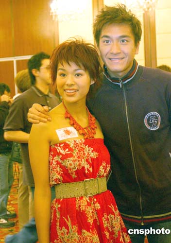 身穿露肩裝的胡杏兒與馬國明,近日出席無線劇集宣傳記者會。作者:譚達明