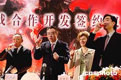 四月十八日,電影版網(wǎng)絡(luò)游戲《無(wú)極》在北京舉辦了新聞發(fā)布會(huì).由派格無(wú)極數(shù)字文化環(huán)球傳媒公司與法國(guó)軟件開(kāi)發(fā)商育碧公司聯(lián)手開(kāi)發(fā),以中國(guó)電影導(dǎo)演陳凱歌的作品《無(wú)極》為主題的網(wǎng)絡(luò)游戲,將正式在國(guó)內(nèi)開(kāi)發(fā)該款游戲產(chǎn)品.據(jù)悉,這是中國(guó)電影界首次開(kāi)發(fā)電影網(wǎng)絡(luò)游戲。圖為陳凱歌(左二)與主辦方開(kāi)香檳慶祝。作者:韓藝冰