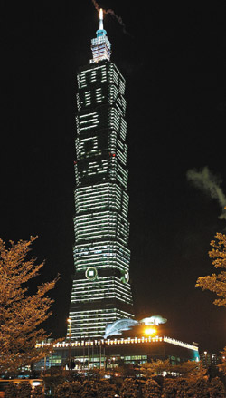據(jù)臺(tái)灣聯(lián)合報(bào)報(bào)道,臺(tái)北101大樓18日晚先行試燈,清晰可見(jiàn)大樓北面有著相對(duì)論公式E=mc2,大樓西面有著TAIPE。