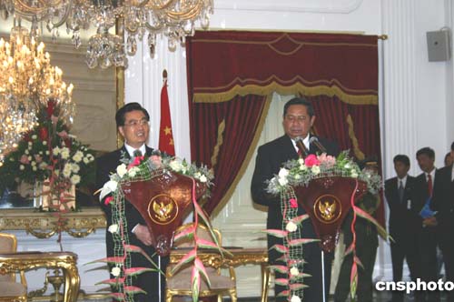 中新網(wǎng)雅加達四月二十五日電(記者李靜)中國國家主席胡錦濤二十五日在雅加達與印尼總統(tǒng)蘇希洛舉行會談。雙方共同簽署《聯(lián)合宣言》,宣布建立中國與印尼戰(zhàn)略伙伴關(guān)系。
