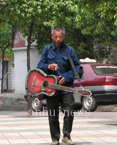 4月25日,記者在銅陵市育才路邊看到一位約有60歲的乞討者一改以往乞討人大多采用的二胡、小銅鑼傳統(tǒng)道具,身背吉他唱著流行的歌曲挨家挨戶進(jìn)行“表演”討錢(qián)。