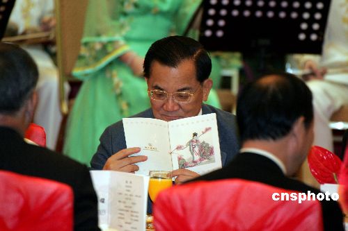 以中國國民黨主席連戰(zhàn)為首的中國國民黨大陸訪問團四月二十七日晚在南京夫子廟狀元酒樓酒店品嘗秦淮風(fēng)味小吃,觀賞民族音樂表演。作者:毛建軍
