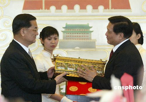 會見結(jié)束后,賓主互贈禮物表深意。劉淇向連戰(zhàn)贈送了微縮的金絲鑲嵌景泰藍(lán)九龍壁,連戰(zhàn)向劉淇回贈祖父連橫的著作《臺灣通史》,自己的近作《改變,才有希望》,以及一個(gè)名為“希望振飛”的琉璃工藝品。