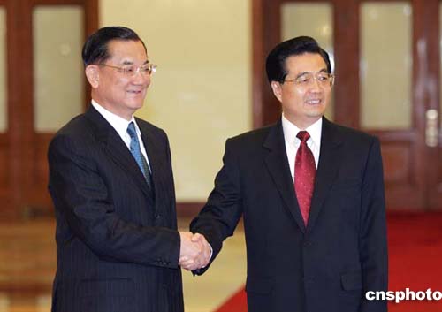 中共中央總書記胡錦濤在北京人民大會(huì)堂與中國國民黨主席連戰(zhàn)會(huì)面,實(shí)現(xiàn)了兩黨最高領(lǐng)導(dǎo)人相隔60年后的歷史性握手。