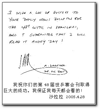 “兩周前當(dāng)我來到上海,我所看到的一切告訴我,上海為這屆世乒賽作了充分的準(zhǔn)備。三天前我再次走下飛機(jī),一路上到處是彩旗、海報(bào)、宣傳廣告,我看到了布置一新的主、副場館,感受到親切的接待服務(wù)。我還聽說人們熱情高漲,幾乎所有的球票都賣完了。這使我更加確信,上海已經(jīng)完全準(zhǔn)備好了。”國際乒聯(lián)主席沙拉拉昨天在接受本報(bào)記者專訪時(shí),再一次對上海的世乒賽組織工作豎起大拇指。
