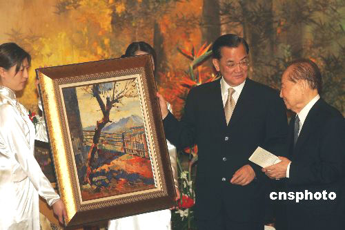 連戰(zhàn)向汪道涵轉(zhuǎn)交辜振甫當年的畫作《陽明山莊》。作者:毛建軍