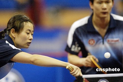 五月二日,在上海體育館舉行的第四十八屆世界乒乓球錦標(biāo)賽進(jìn)入了第三天,混雙首場(chǎng)大戰(zhàn)全面打響,中國香港選手梁柱恩、桑亞嬋在比賽中戰(zhàn)勝韓國選手晉級(jí)第二輪比賽。圖為梁柱恩、桑亞嬋在比賽中。作者:盛佳鵬