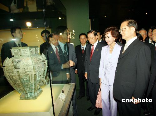 五月二日,連戰(zhàn)一行在上海博物館參觀,連戰(zhàn)夫婦對(duì)該館陳列的青銅器饒有興趣。作者:潘索菲