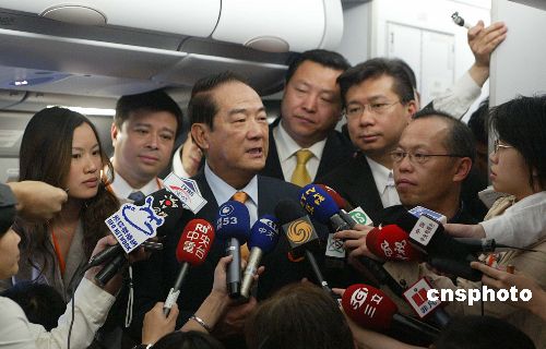 圖:宋楚瑜在飛機(jī)上回答記者提問