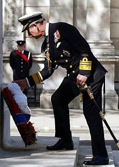 中新網(wǎng)5月9日電 據(jù)法新社報道,英國舉行了紀念歐洲勝利日六十周年的慶;顒樱(zhàn)老兵和數(shù)百名公眾參加在白廳舉行的紀念活動。圖為英國王儲查爾斯王子向紀念碑敬獻花圈。(固山)