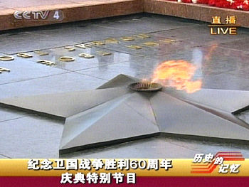 5月9日,俄羅斯在莫斯科紅場(chǎng)舉行紀(jì)念衛(wèi)國(guó)戰(zhàn)爭(zhēng)勝利60周年慶典。圖為各國(guó)元首向無名烈士墓獻(xiàn)花,中國(guó)國(guó)家主席胡錦濤出席儀式。(央視截圖)