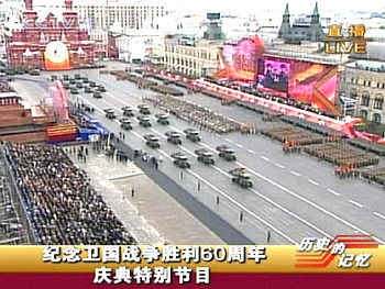 5月9日,俄羅斯在莫斯科紅場(chǎng)舉行紀(jì)念衛(wèi)國(guó)戰(zhàn)爭(zhēng)勝利60周年慶典。(央視截圖)