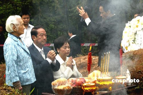 十時(shí)三十分許,按照故鄉(xiāng)世代相襲的習(xí)俗,祭拜由地方主祭人主持,宋楚瑜在曾祖父墓前鞠躬、上香、敬酒、獻(xiàn)果、叩拜、獻(xiàn)花圈。宋楚瑜代表多年前遠(yuǎn)離故土的宋家人誦讀著祭文:赫赫先靈,衍脈隆興,三湘延慶,禹宇昌榮……沒(méi)有祭樂(lè),空靈的山頭在聆聽(tīng)著這位游子對(duì)故土、故人的幾許深情。字字句句,情真意切。此情此景讓已是鶴顏白發(fā)的宋母和“湘潭媳婦”夫人陳萬(wàn)水潸然淚下,情不能已。