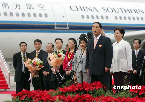 宋楚瑜一行甫抵機(jī)場(chǎng)便受到官員、臺(tái)商、迎賓孩童的夾道歡迎。史家小學(xué)六年級(jí)的董奕辰是他們中最早和宋楚瑜交流的人。