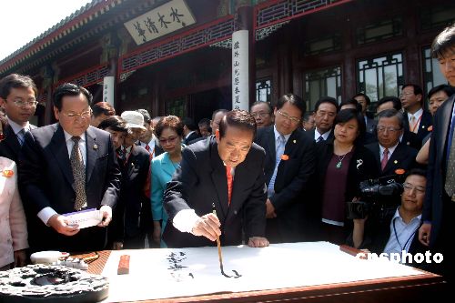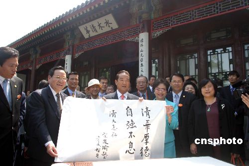 五月十一日上午,親民黨主席宋楚瑜在清華大學發(fā)表演講,演講結束后,親民黨主席宋楚瑜率親民黨大陸訪問團清華大學的主要景點和經(jīng)典建筑并題寫“清華厚德自強不息”。作者:張勤