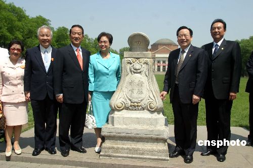 五月十一日上午,親民黨主席宋楚瑜在清華大學發(fā)表演講。之后,親民黨主席宋楚瑜和夫人等參觀了清華大學的主要景點和經典建筑,并與中臺辦主任陳云林(右一)、清華大學校長顧秉林(右二)在日晷前合影。作者:張勤