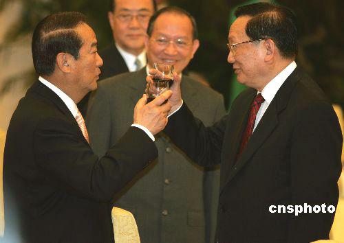 五月十一日晚,中共中央政治局常委曾慶紅在北京人民大會(huì)堂宴請親民黨主席宋楚瑜一行,宋楚瑜致詞后向出席宴會(huì)的國務(wù)委員唐家璇敬酒。作者:任晨鳴